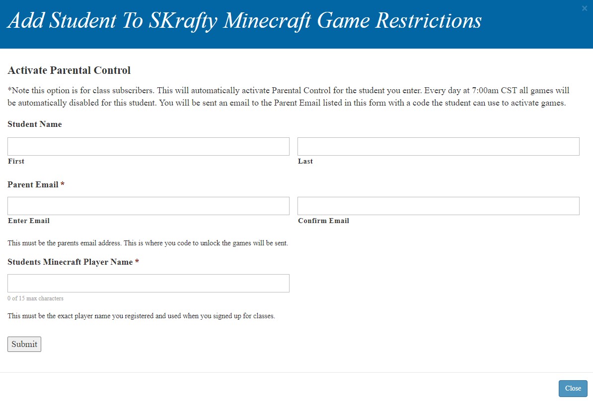 This SKrafty feature will automatically activate Parental Control for the student you register for the feature. Every day at 7:00am CST all SKrafty server games will be automatically disabled for this student, but still be able to access the SKool build servers. You will be sent an email to the Parent email listed in this form with a code the student can use to activate games. *This feature is only available for Java Minecraft players utilizing a course Subscription plan.*